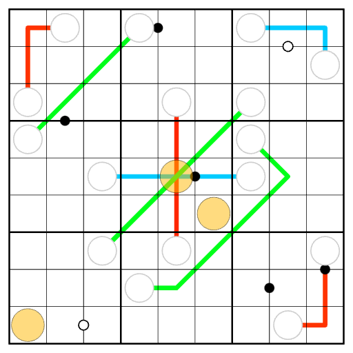- Between lines. The values of the digits along a coloured line must be strictly between the values of the two digits in the attached white circles. Every line has got one and only one colour.
