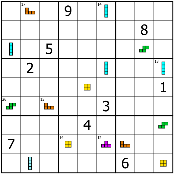 Little tetromino clues indicate the shape of the region a cell is in, and the region's digits must sum to the given total, if specified in the cell's top left corner. Shape clues *can* be rotated and/or flipped to match their regions. Digits do *not* repeat within regions.