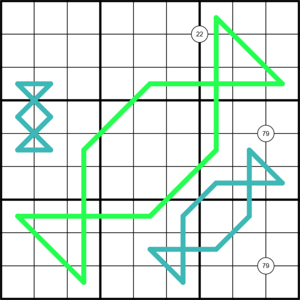 Modular Lines: Any run of 3 digits along a teal modular line must include one digit from each of the modulo 3 sets, i.e. one from (1, 4, 7), one from (2, 5, 8) and one from (3, 6, 9). When a line crosses itself, it continues in the same direction until the next cell.