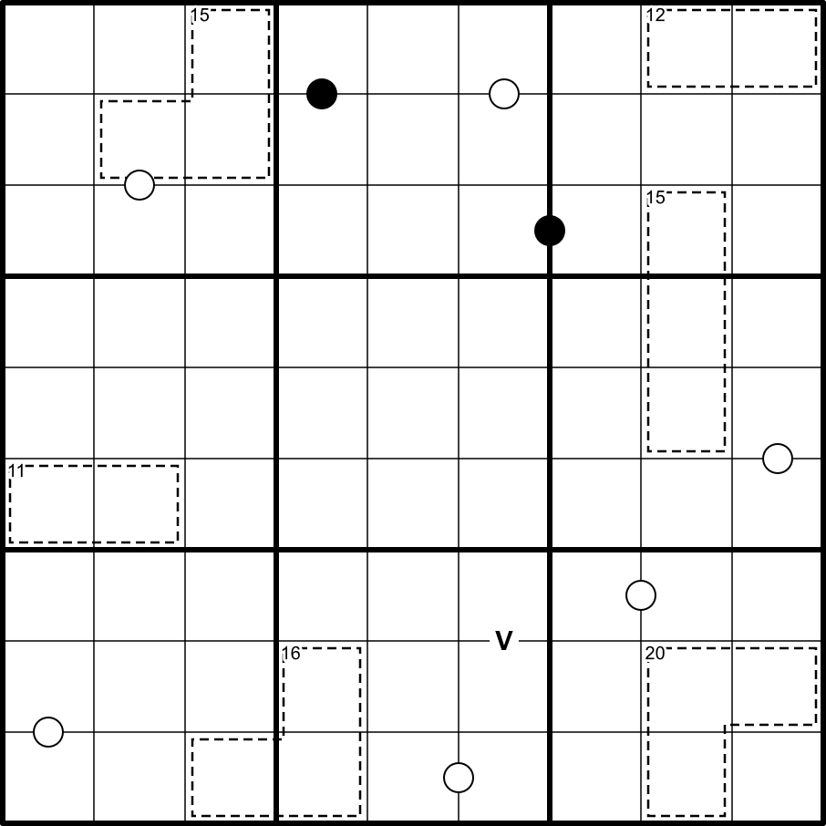 - Draw a one-cell-wide loop of orthogonally connected cells that must pass through every cell in every cage without visiting any cage more than once. The loop cannot touch itself orthogonally but may touch itself diagonally.