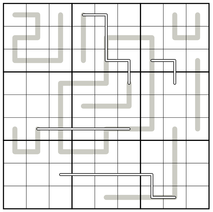 Entropic Lines: (GREY): Any set of three sequential cells along a grey line must contain a low digit (1,2,3), middle digit (4,5,6) and high digit (7,8,9).