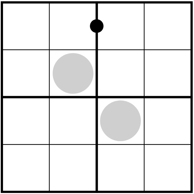 Kropki dots: Cells separated by a black dot have values in a 1:2 ratio. Cells separated by a white dot have values which are consecutive. All possible dots are given.