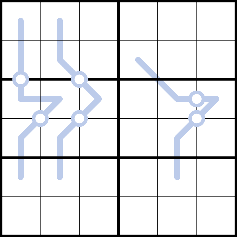 Rules: Normal 6x6 sudoku rules apply: Place the digits 1-6 once each in every row, column and 2x3 box. Dots split lines into segments with equal sums. Digits may repeat on lines but not within a segment. Different lines may have different sums.