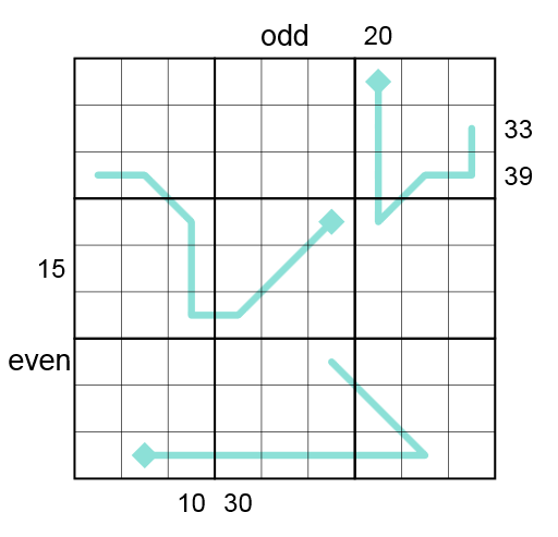 - X-Summen: Ein X-Summen-Hinweis zeigt die Summe der ersten X Ziffern in der entsprechenden Reihe oder Spalte an, wobei X die vom Hinweis aus gesehen erste Ziffer ist. Ein odd/even-Hinweis gibt nur an, ob die entsprechende X-Summe eine gerade oder ungerade Zahl ist.