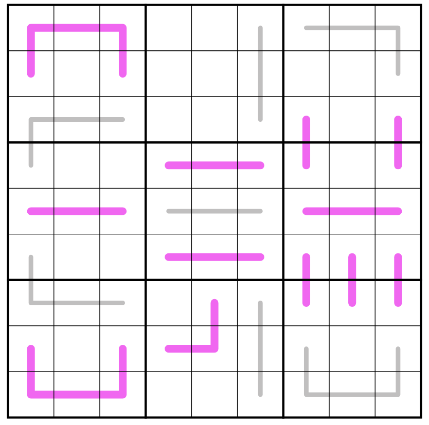 12-LINES (GREY): Each grey 12-Line consists of one or more contiguous groups of cells, each of which sums to 12. These groups of cells cannot overlap; every cell is part of exactly one group. Digits may repeat freely on lines and even within sums if other rules allow.