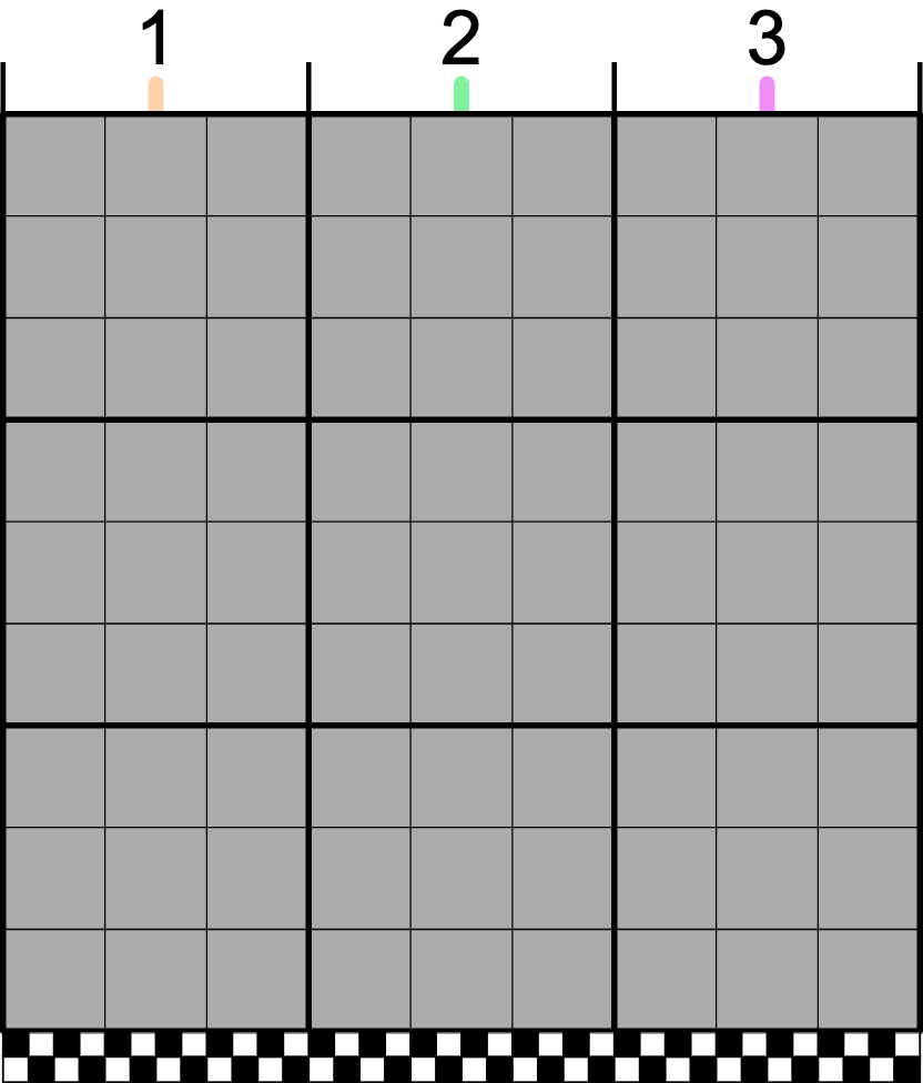Car 1, 2 and 3 are racing. All Cars reach the finish line. I.e. all lines traverse from the top of the grid to the bottom. The first car to reach the finish line with all of it's digits placed and fog cleared wins!