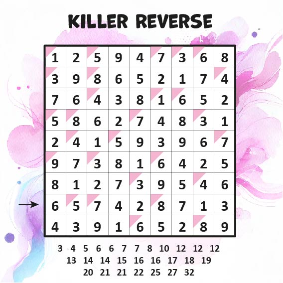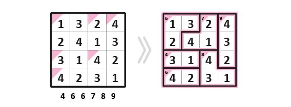 Die rosafarbenen Dreiecke markieren jeweils das erste Feld der ersten Zeile eines Gebiets. Somit gilt für die Position der Dreiecke dasselbe wie bei den kleinen vorgegeben Summen in Killer-Sudokus/Gebietssummen.