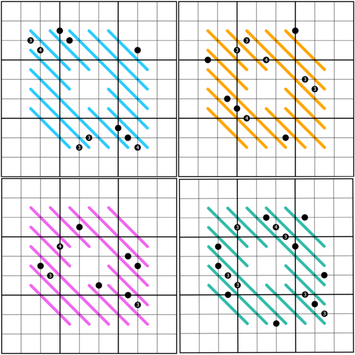 - Modular lines: Jede Gruppe von drei benachbarten Zahlen auf einer türkisen Linie muss drei verschiedene Reste haben wenn sie durch drei geteilt werden.