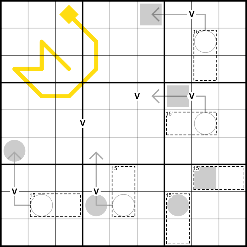 - The digit in the Nth cell along the gold line (starting from the diamond) indicates the position along the line where the digit N appears. e.g. a 4 in the diamond puts a 1 in the fourth position.