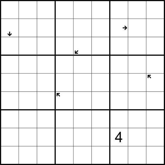 Cells with an arrow clue act as internal loop x-sum clues: a digit in a clued cell indicates the sum of the first X digits on the loop in the indicated direction, where X is the digit in the first loop cell in that direction (not including the clued cell itself). X cannot be larger than the number of loop cells in the indicated direction, and the clued cell may or may not be on the loop.