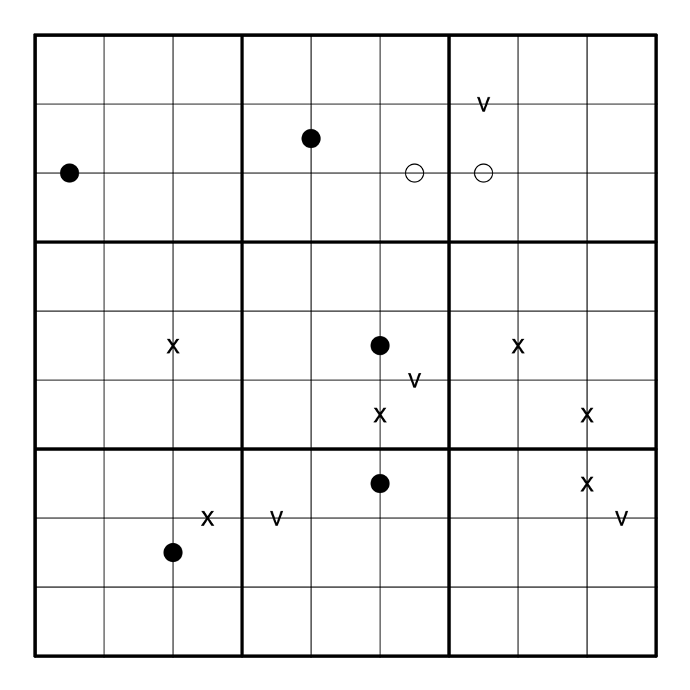 Some but not all unambiguous binary constraints are shown. An ambiguous binary constraint is one where two or more binary constraints would be true, and these would never be shown or counted. On the edges between 3x3 grid blocks there are NO binary constraints, either ambiguous or unambiguous.