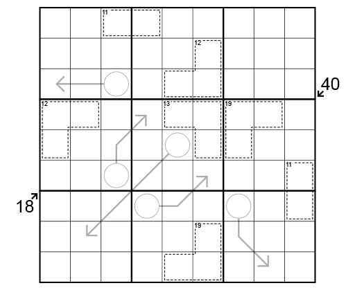 - Pfeile: Ziffern auf einem Pfeil summieren sich zu der Ziffer in dem Kreis, von welchem der Pfeil ausgeht.