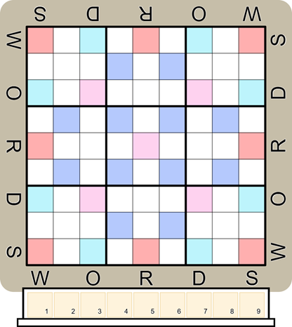 After the game, replace each letter with its points value and fill in the grid according to regular sudoku rules: fill each row, column and 3x3 box with the digits 1-9 once each.