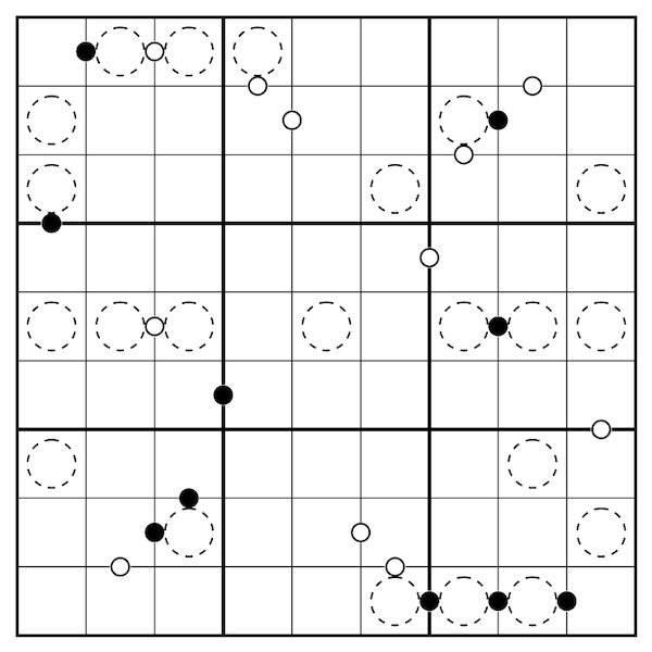 - Masyu: Zeichne eine nicht schneidende Schleife durch die Mittelpunkte einiger Zellen, die durch jeden großen Kreis verläuft. Die Farben dieser Kreise müssen vom Löser bestimmt werden. Die Schleife muss an schwarzen Kreisen abbiegen und gerade durch die Zellen auf beiden Seiten verlaufen. Die Schleife muss gerade durch weiße Kreise verlaufen und in mindestens einer der Zellen auf beiden Seiten abbiegen. Es sind nicht alle gültigen Kreise gegeben.