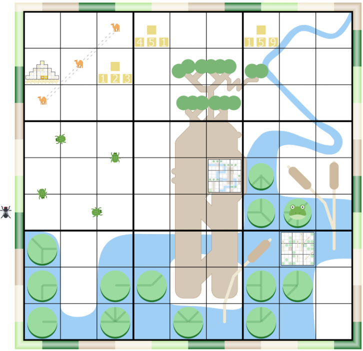 I'm amazed, what a beautiful sudoku journey! I especially enjoyed the desert region. And the frogs could be their own entire puzzle genre