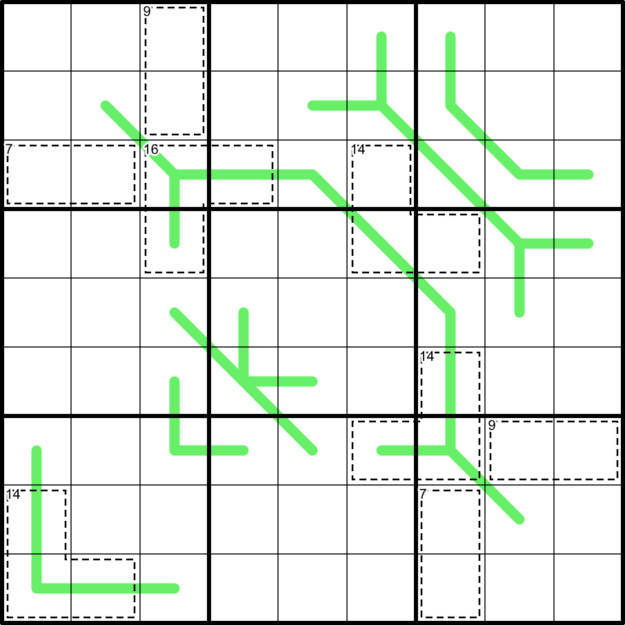 German Whispers: Adjacent digits along a green line must have a difference of at least 5.