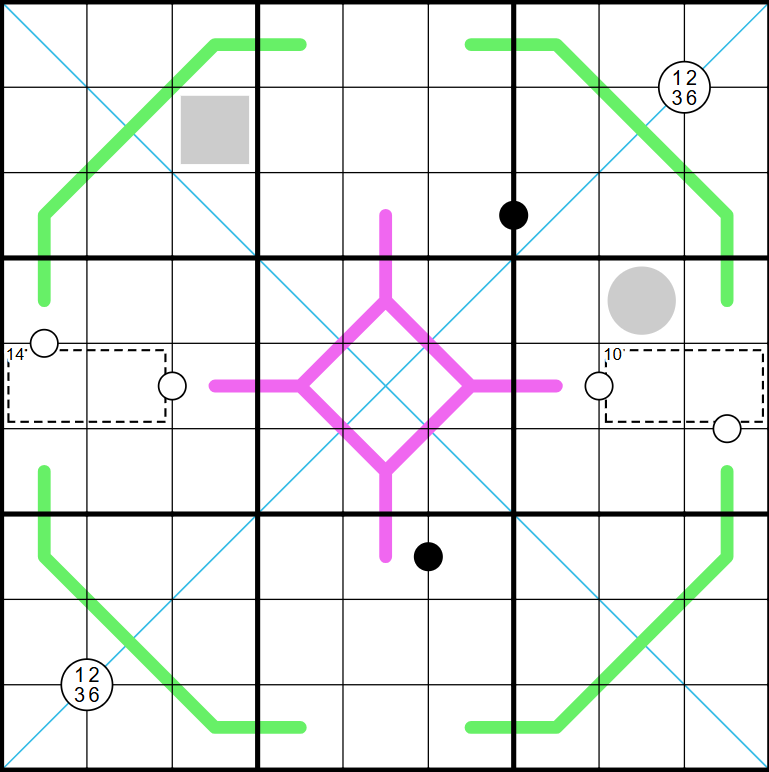 - Quadruple rule applies (Digits in a large white circle must appear in the squares around the circle)