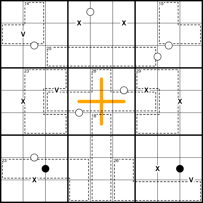 Not all Xs, Vs or dots are given.