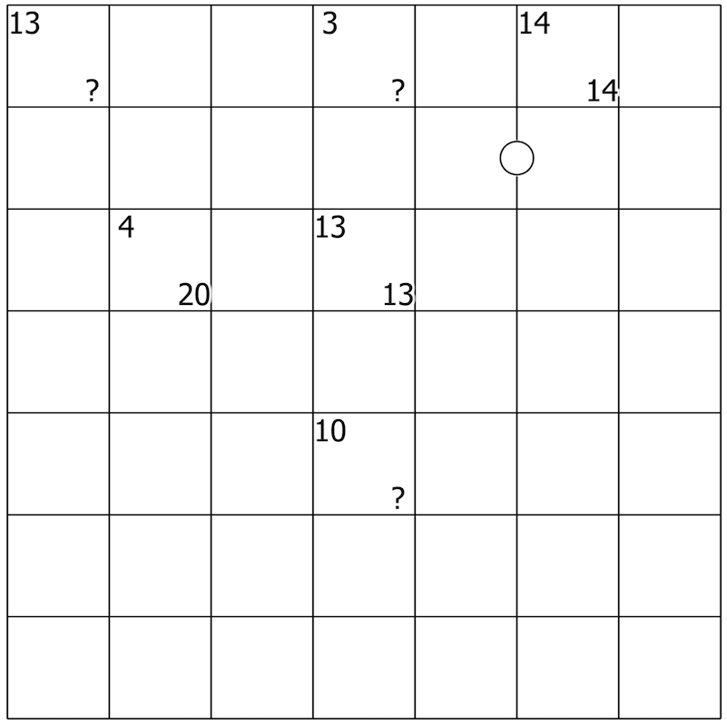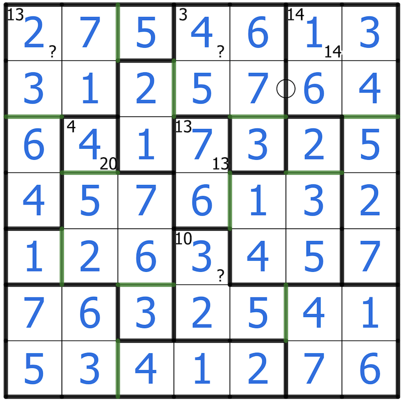 Extraregel für das Beispielrätsel: Zwei von einem weissen Punkt getrennte Ziffern müssen einen Unterschied von 1 haben.