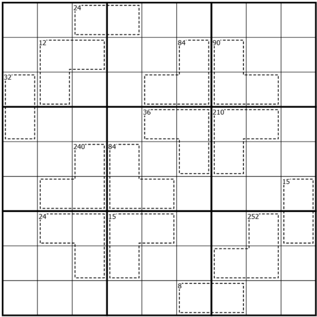 Die kleinen Zahlen in der oberen linken Ecke jedes gestrichelt markierten Gebiets gibt das Produkt der Ziffern in diesem Gebiet an.