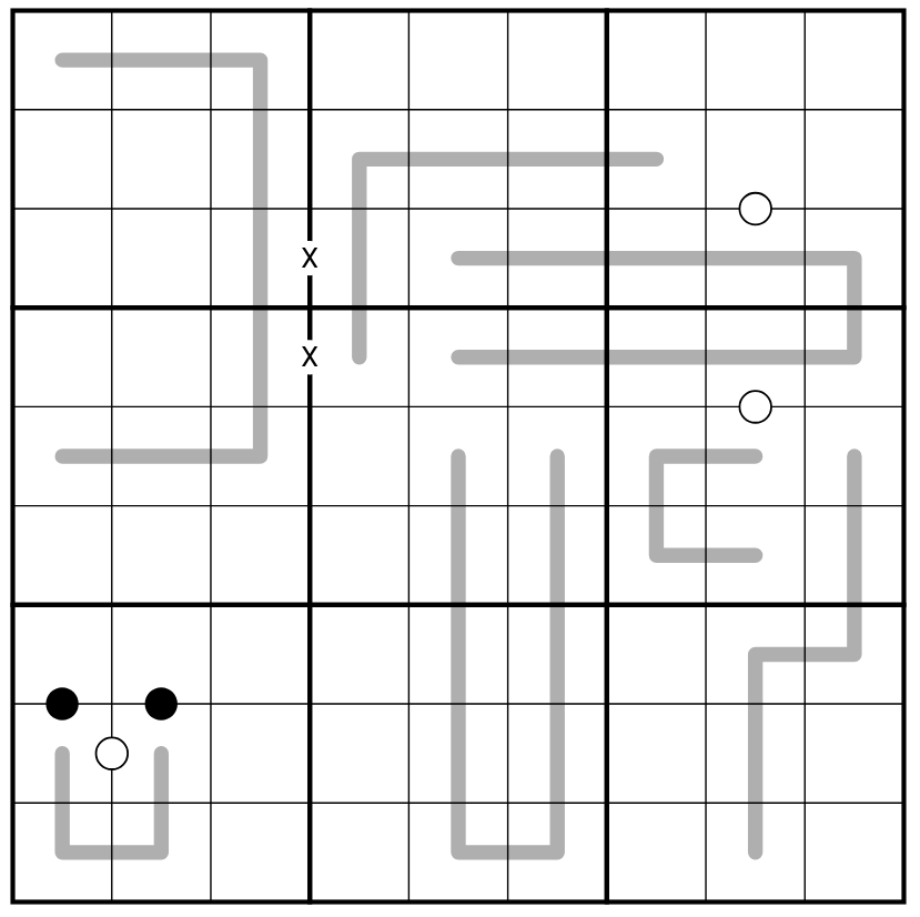 X-pairs. Cells separated by a "X" must sum to 10. Not all X-pairs are given.