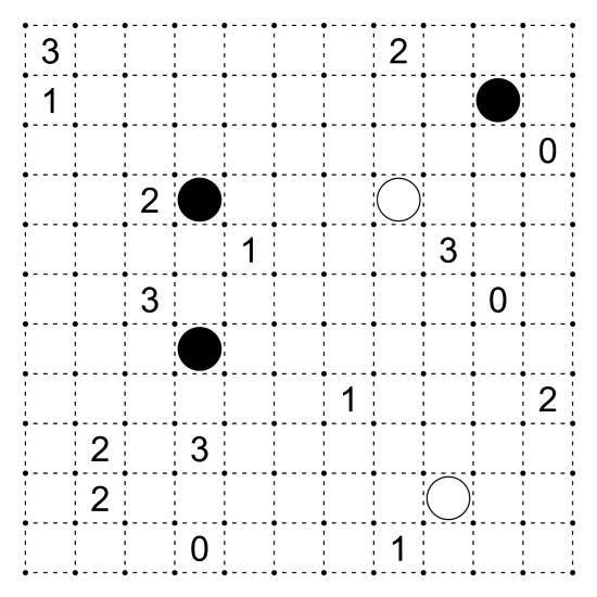 Slitherlink: Connect some pairs of orthogonally adjacent dots to form a single non-intersecting loop. Number clues represent the number of edges surrounding the clue (up to four) that are segments of the loop.