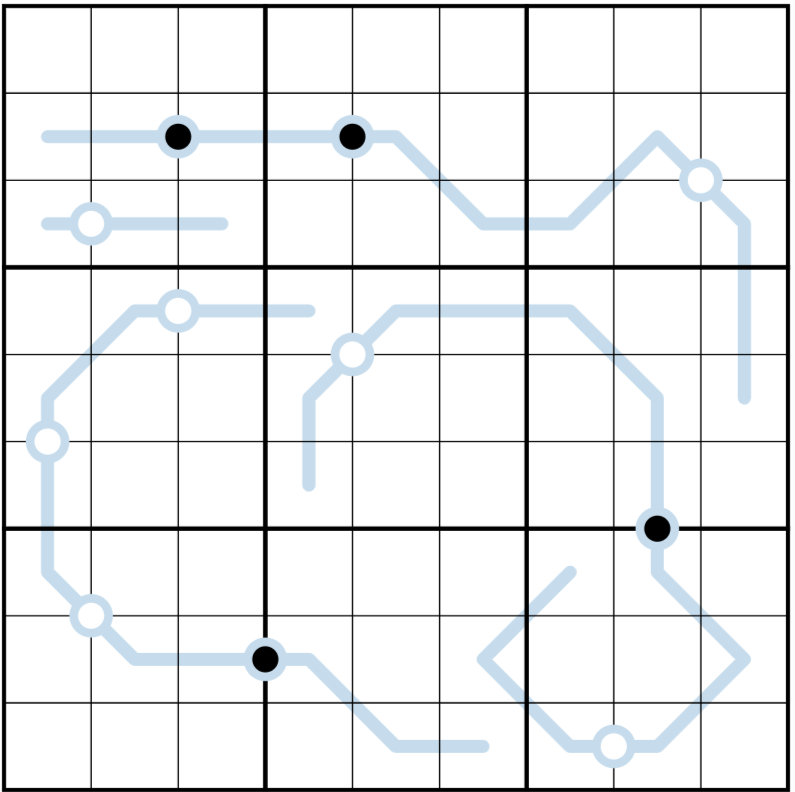 - Kropki Separators: On an Equal Split Line, digits on opposite sides of a black dot must be in a 1:2 ratio. Digits on opposite sides of a white dot must be consecutive.