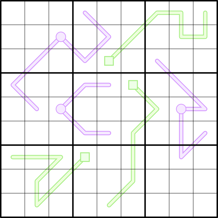 • Index Lines: The digit in the Nth cell along a green line (starting from the square) indicates the position along the line where the digit N appears. E.g. a 3 in the square puts a 1 in the 3rd position.