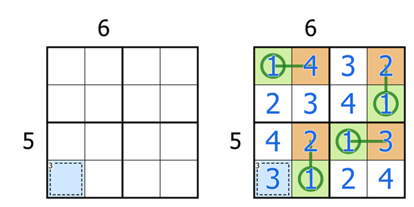 • Seen: Ziffern dürfen sich in einem See nicht wiederholen. Die Summe der Ziffern in einem See ergibt den Wert oben links, falls angegeben.