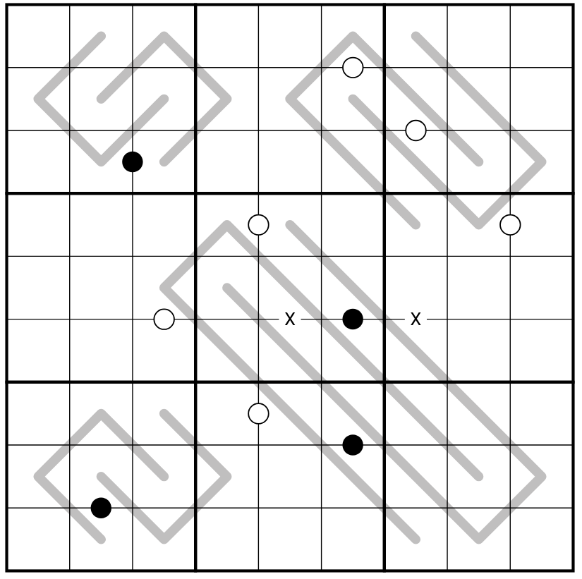 MODULO-3 LINES: The grey lines are modulo-3. Any set of three sequential cells along a grey line must contain a complete set of residues modulo-3: one digit from (1,4,7), one from (2,5,8), one from (3,6,9).