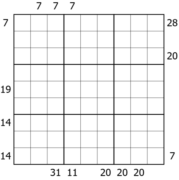 Hinweise außerhalb des Gitters geben die Summe der ersten (alle!) Sequenz aufsteigender Ziffern angefangen von der ersten Ziffer der entsprechenden Seite an. Eine Sequenz kann aus einer einzigen Ziffer bestehen.