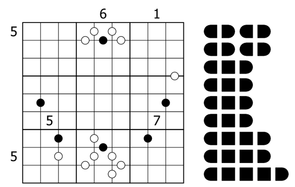 - Kropki-Punkte: Ziffern, die durch einen weißen Punkt getrennt sind, sind aufeinanderfolgend. Ziffern, die durch einen schwarzen Punkt getrennt sind, haben ein Verhältnis von 1:2, was bedeutet, dass eine genau doppelt so groß ist wie die andere. Es sind nicht unbedingt alle Punkte gegeben.