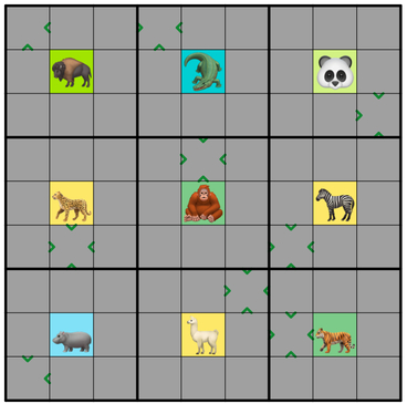 Large square: You don’t need to find this one, it is simply the exterior outline of the 9x9 grid. This is the outermost limit of the zoo, it cannot extend beyond it. Any other grid lines or 3x3 box outlines do not necessarily count as walls.