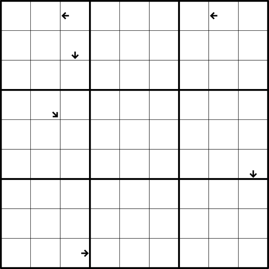Cells with an arrow clue act as internal loop x-sum clues: a digit in a clued cell indicates the sum of the first X digits on the loop in the indicated direction, where X is the digit in the first loop cell in that direction (not including the clued cell itself). X cannot be larger than the number of loop cells in the indicated direction, and the clued cell may or may not be on the loop.