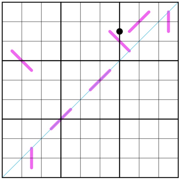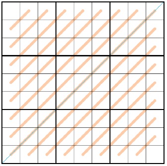 To make the final line clearer, the orange lines along each diagonal are entropy lines, and each 3 consecutive cells must contain a low digit (1,2,3), middle digit (4,5,6) and high digit (7,8,9).