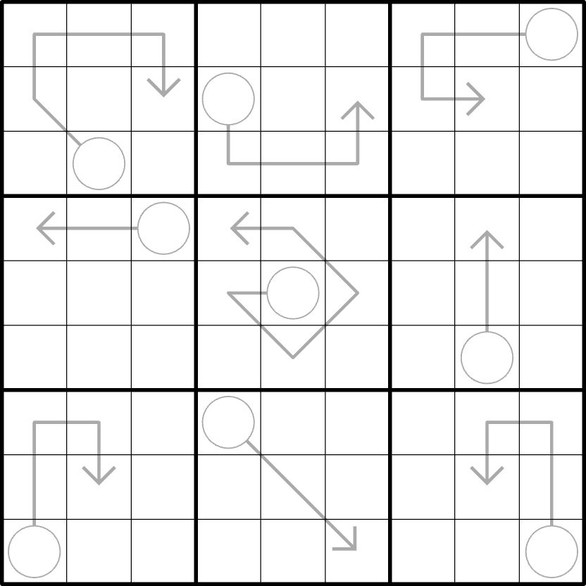 There are nine "squire" cells in the grid, one in every row, column and box. Each digit from 1-9 appears in a "squire" cell exactly once.