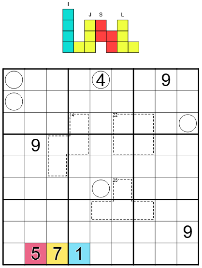 • Cells with circles must not be a part of any Tetromino, and allow 1's, 5's, and 7's to be placed outside of their assigned Tetromino