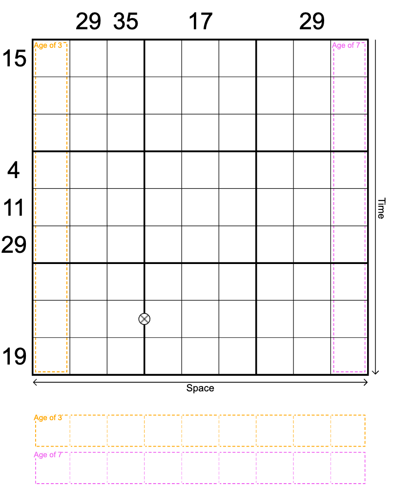Space-Time: Each row of the grid represents a slice of time, with the top row as the earliest and the bottom row as the latest. Each column of the grid represents a different location in space.
