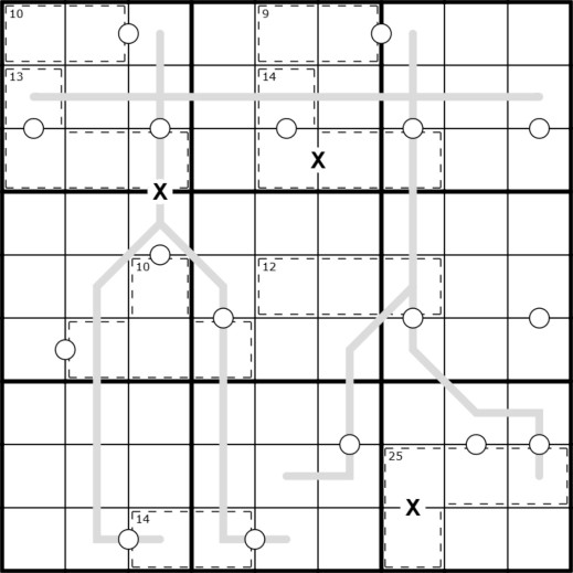 Normal Sudoku rules apply. KROPKI PAIRS- Numbers with a white dot between them are consecutive. KILLER CAGES- Numbers in cages sum to the number in the top left corner of the cage. Numbers do not repeat in cages. XV PAIRS- Numbers with an X between them sum to 10. Not all possible dots and Xs are given. GRAY LINES are only to show the constellation, and do not affect the puzzle.