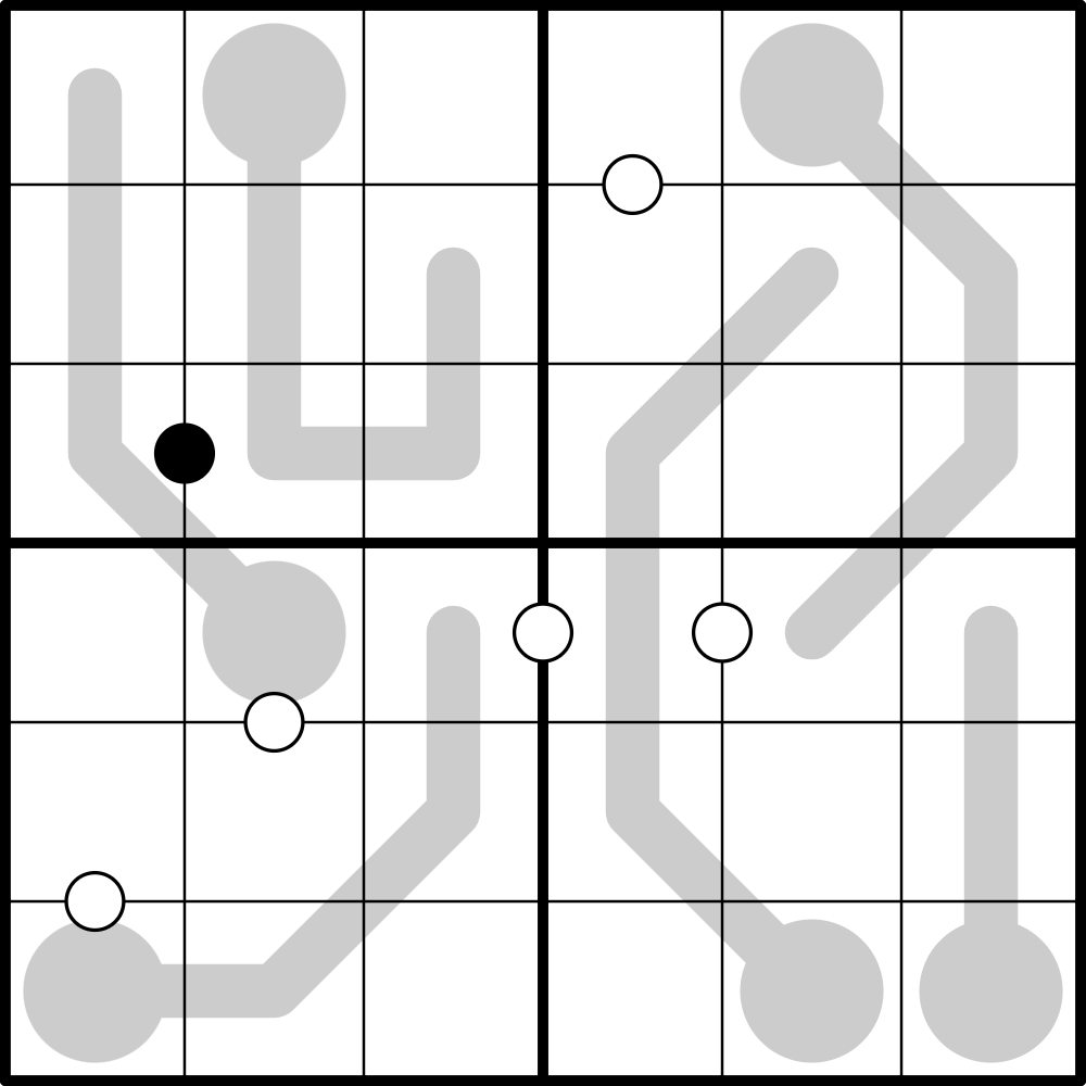 Kropki Pairs: Cells separated by a white dot must be consecutive. Cells separated by a black dot must be in a two-to-one ratio.
