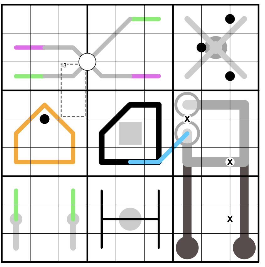 5. Boxes 5, 6 and 9 – The Mighty AT-AT: - Black head contains Renban lines. - The square in the head is an even digit. - The blue connection is a Region Sum line (digits sum to the same total in each box it crosses). - The core (two bulbs) is an In-Between line (digits between the endpoints). - Legs are thermometers (numbers increase from bottom to top). - X’s in the grid must sum to 10.