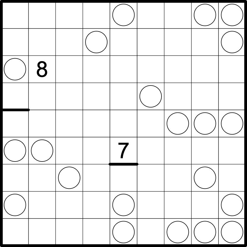 A digit in a circle indicates how many of the (up to 8) surrounding cells are part of the same region. Not all circles are given.