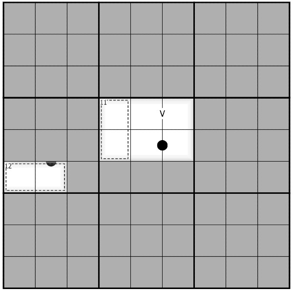 Hint 1: There is a specific interaction involving black dots and V's that is of importance here. To start you out, think about whether it's possible for a 1 to go on a black dot that sees a V. Hint 2 explains it.