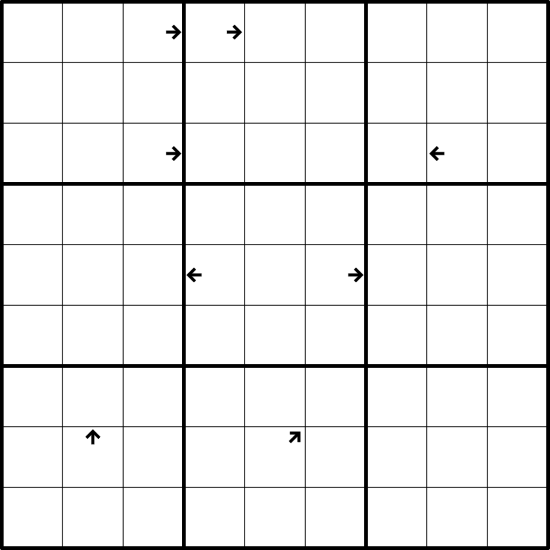 Cells with an arrow clue act as internal loop x-sum clues: a digit in a clued cell indicates the sum of the first X digits on the loop in the indicated direction, where X is the digit in the first loop cell in that direction (not including the clued cell itself). X cannot be larger than the number of loop cells in the indicated direction, and the clued cell may or may not be on the loop.