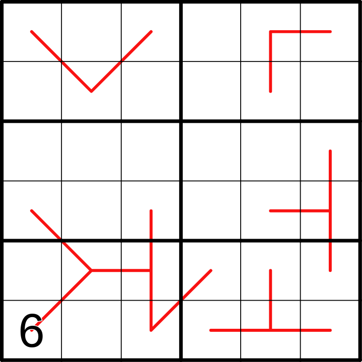 *On red lines, place all Friendly Digits (1-6) and all orthogonally connected Friendly Sums (3-6).