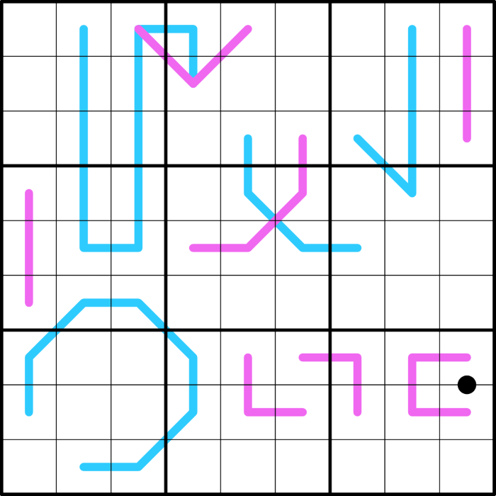 A blue region sum line is divided into segments by box borders, and the digits on each segment of a line have a same sum.
