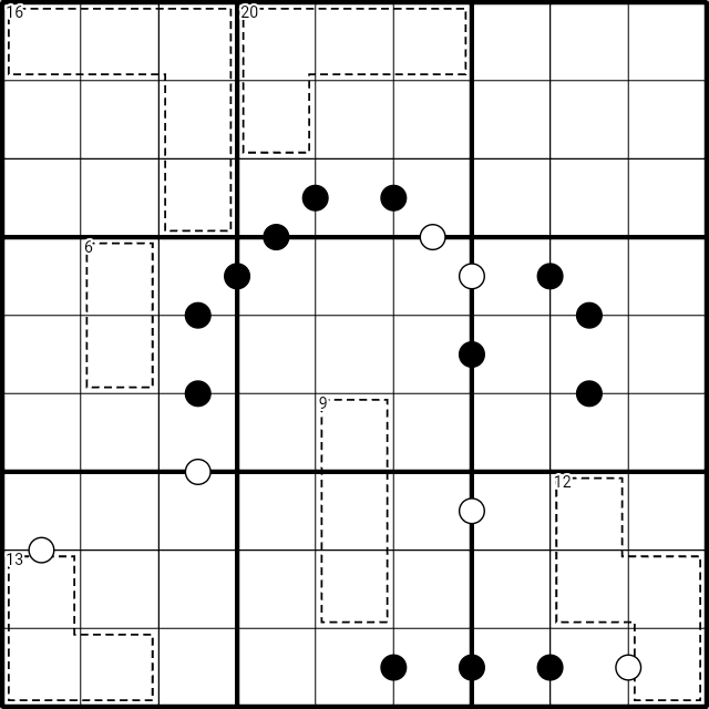 1) Platzieren Sie die Ziffern so, dass sie sich in keiner Zeile, Spalte und markierten 3x3-Box wiederholen.