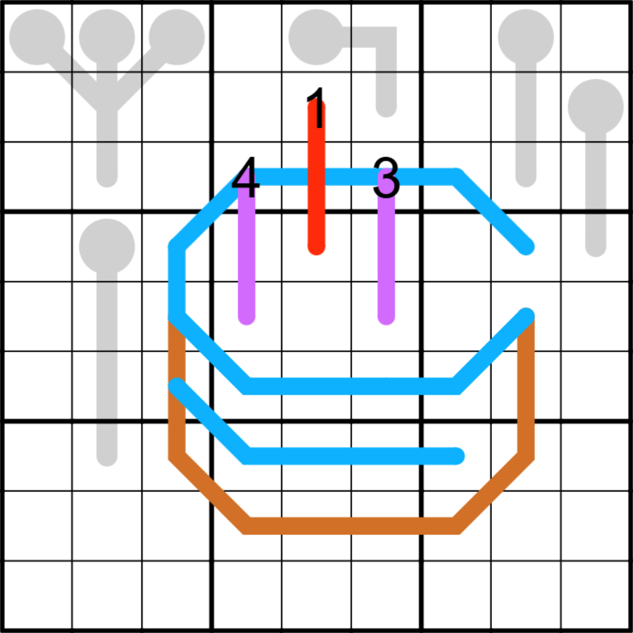 8-Line (Brown): the brown line consists of contiguous groups of cells, each of which sums to 8. Groups cannot overlap. Additionally, the digits 1-8 must appear on the brown line at least once.