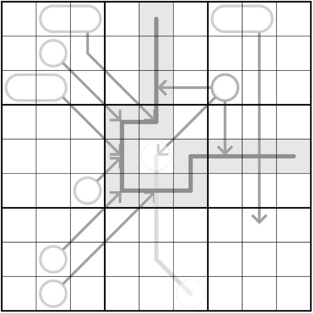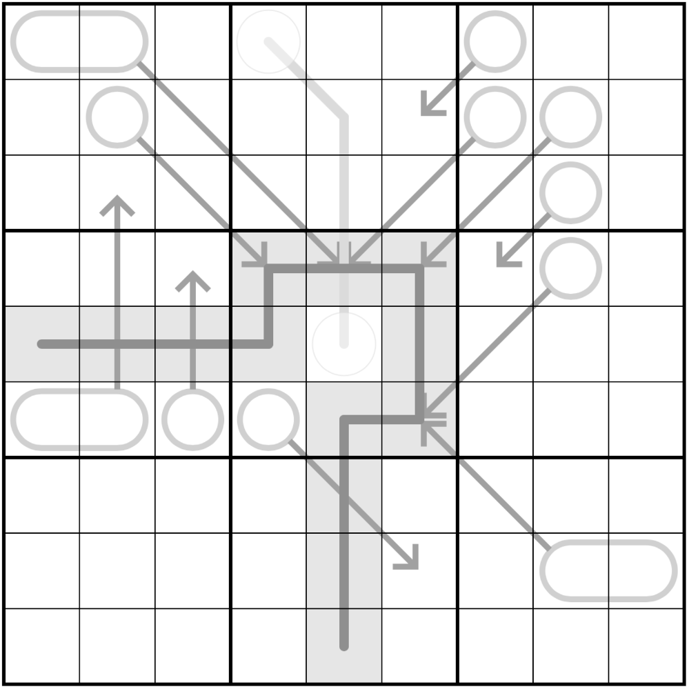 Wie unten abgebildet besteht das Rätsel Under Siege aus vier Sudokus, eines für jeden Turm der Festung. Diese Sudoku-Rätsel folgen den gleichen Regeln, aber sind alle unabhängig voneinander. Sie können die Bilder anklicken um zwischen den jeweiligen Türmen zu navigieren: