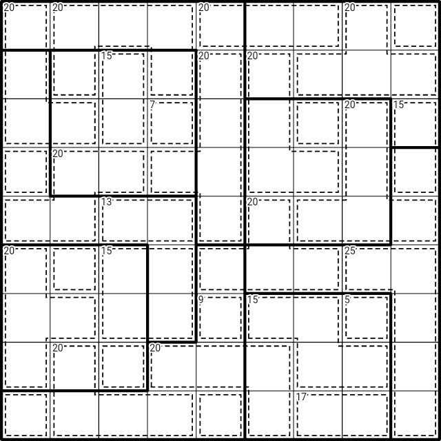 Platzieren Sie die Ziffern 1-9 in jeder Zeile, jeder Spalte und in jeder Region. Die Summe der Ziffern in einem Killerkäfig muss ohne Wiederholung die angegebene Summe ergeben.